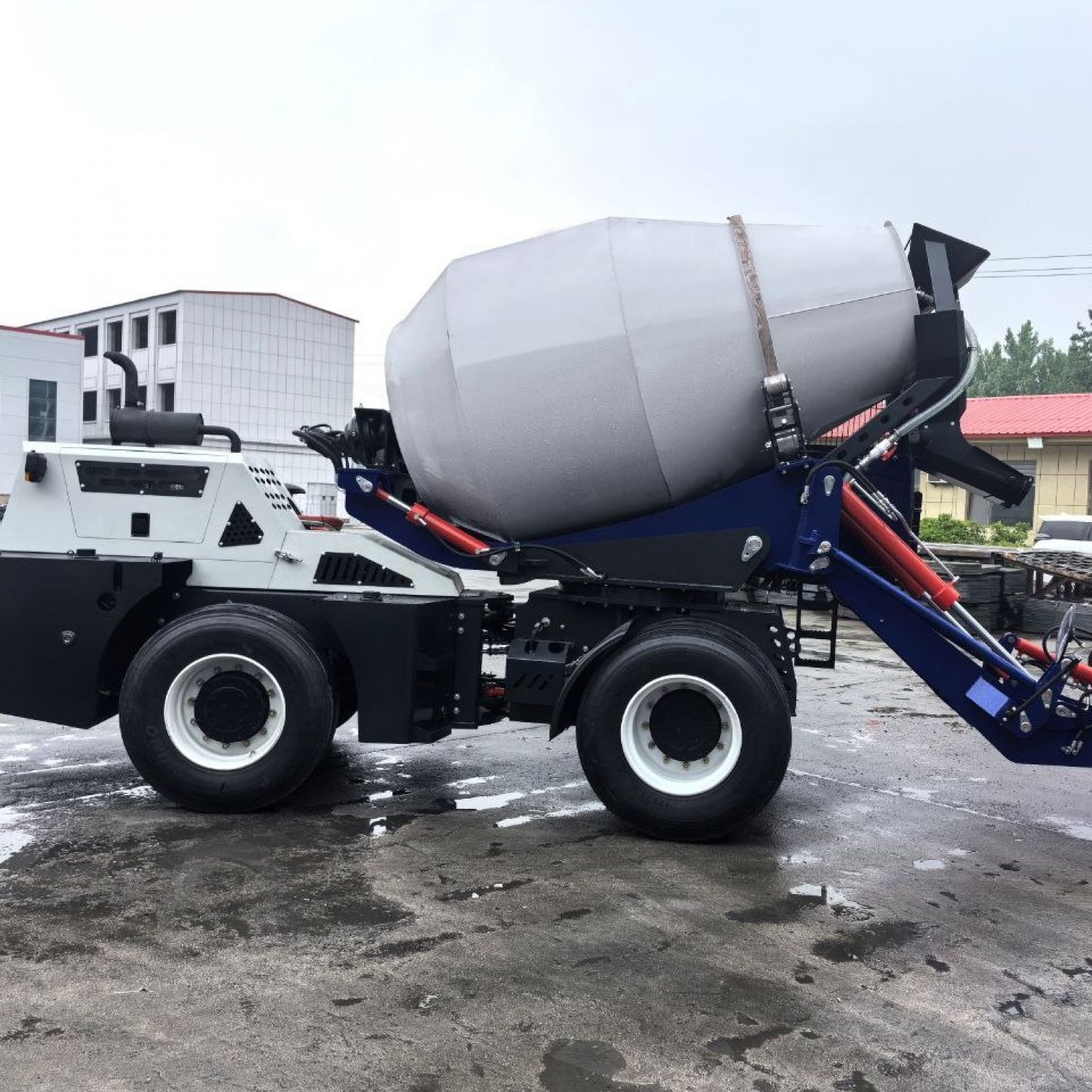 | Вращение барабана, управление насосом скорости потока меняется автоматически или вручную из кабины. Выгрузка производится рычагом | |